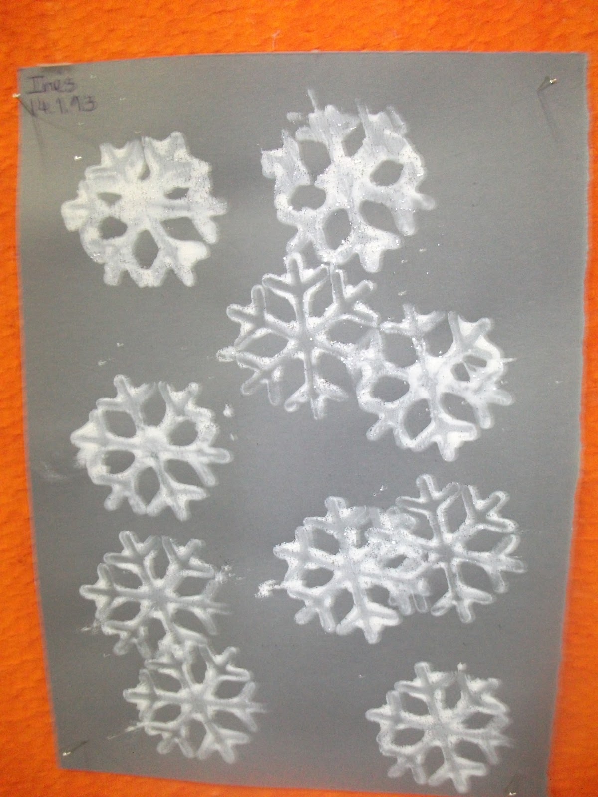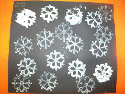 Noutro dia explorámos uns carimbos em forma de floco de neve e marcámo-lo numa cartolina preta e cincenta, juntei á tinta um pouco de farinha para obter algum volume nesta tecnica de pintura, aqui fica o resultado:
