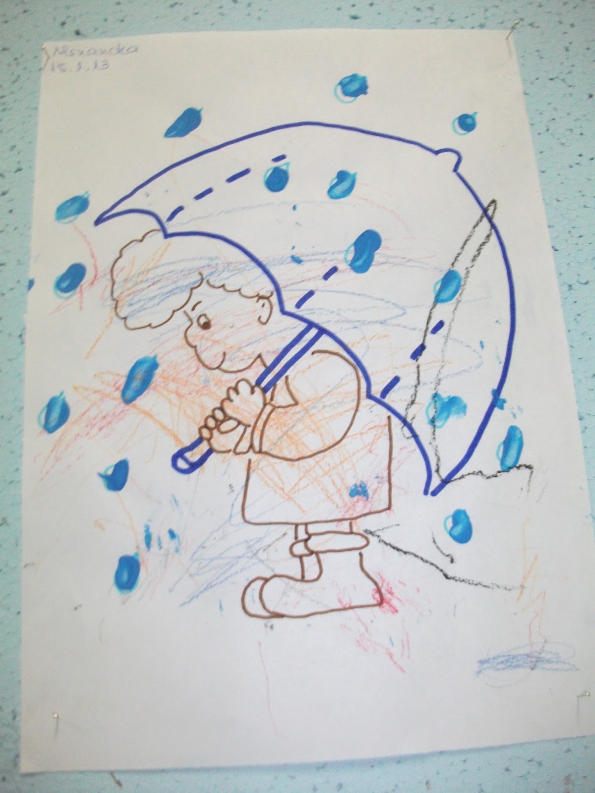 começámos por colorir com lápis de cera um desenho e com o dedo molhado em tinta desafiei-os a preeencher as gotinhas de chuva do seu desenho! ficou bem catita!!