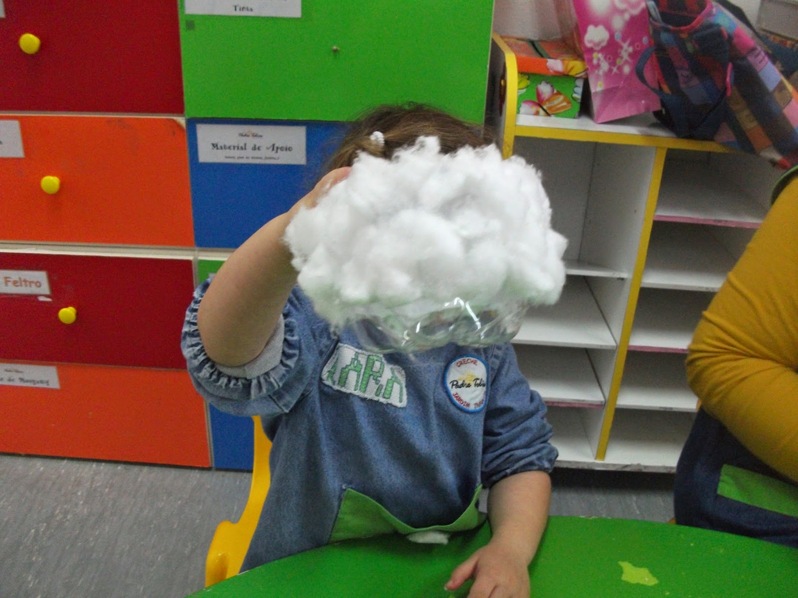 Iniciámos então a elaboração do nosso cordeirinho, cortámos pedaços de algodão e colámos na nossa estrutura usando coma branca diluída num pouco de água, assim...