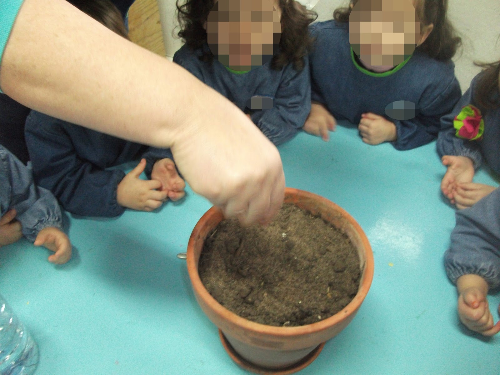 Surgiu aqui o nosso primeiro problema... «não temos um regador...» Aline e a solução também apareceu: « Eu tenho um na minha casa!» Inês