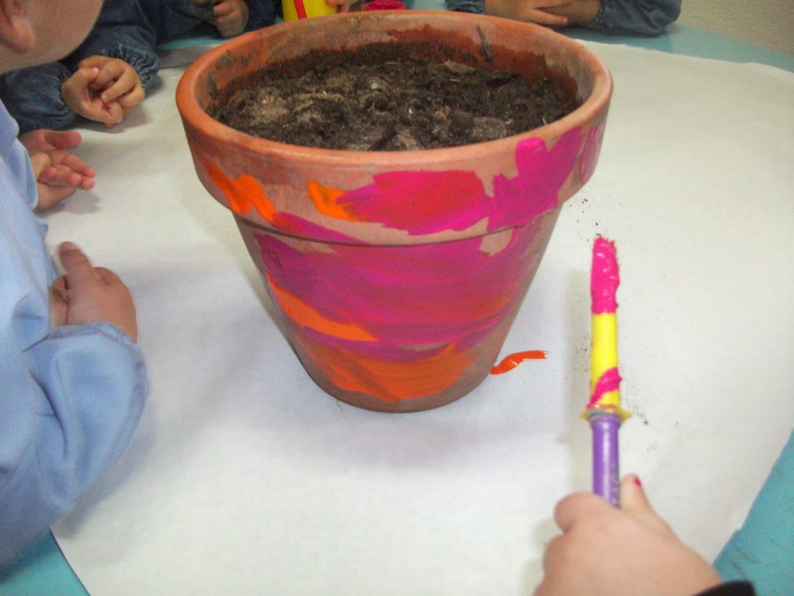 O vaso que a Alexandra trouxe é de barro e decidimos pintá-lo com pincéis e tintas!